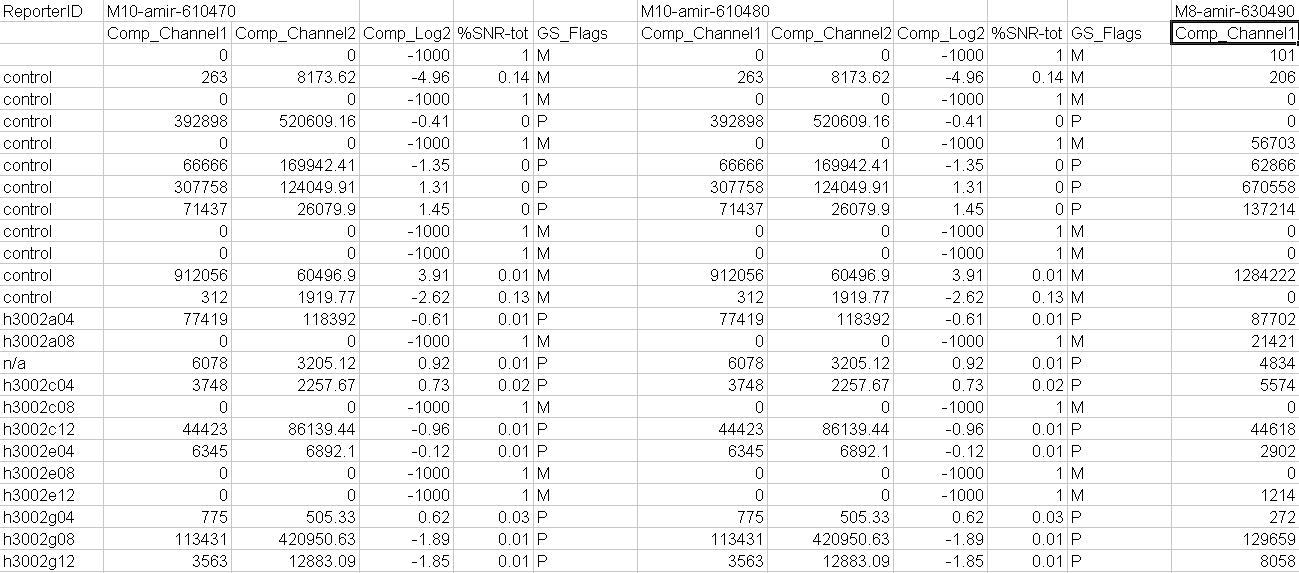 The 2. example shows setup to create a combined data file where only Normalized Intensities, Log ratio a Signal score and a Quality flag are combined :